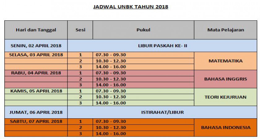 Tanggal Penting Pelaksanaan UNBK Tahun 2018 March 26, 2018May 7, 2022 Me by Bagi peserta didik kelas 12 harap memperhatikan tanggal penting pelaksanaan UNBK Tahun 2018.Semoga sukses anak-anak. Read Views: 2